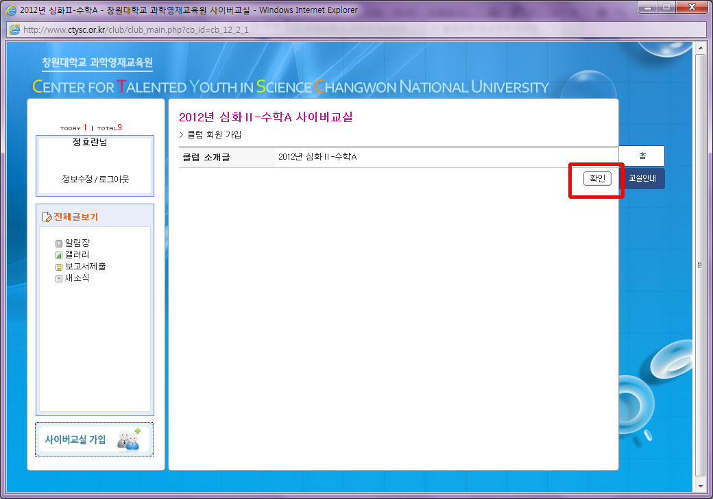사이버교실 가입 화면에서 오른쪽 상단에 있는 빨간 네모의 확인을 클릭해서 사이버교실의 가입을 완료하시면 됩니다.