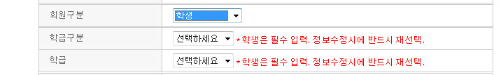 자신의 정보를 맞게 기입 합니다. 그리고 제일 중요한 회원 구분을 잘 선택해야 합니다.(회원구분을 잘못 선택하면 사이버 교실에 가입을 하지 못합니다.) 영재원 학생이면 학생을 선택하시고 학부모님이시면 학부모를 선택해주세요![]()