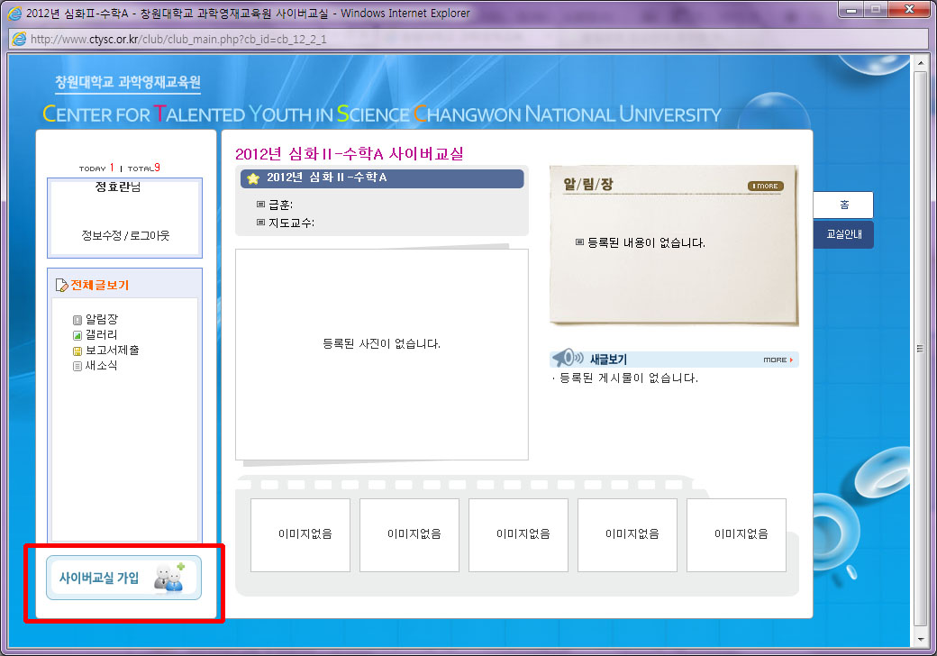 정회원 승인이 되어야 사이버교실에 가입신청을 할 수 있으니 회원가입 후 적어도 1일 후에 아래에 내용을 따라 사이버교실에 다시 가입해 주시기 바랍니다.![]()