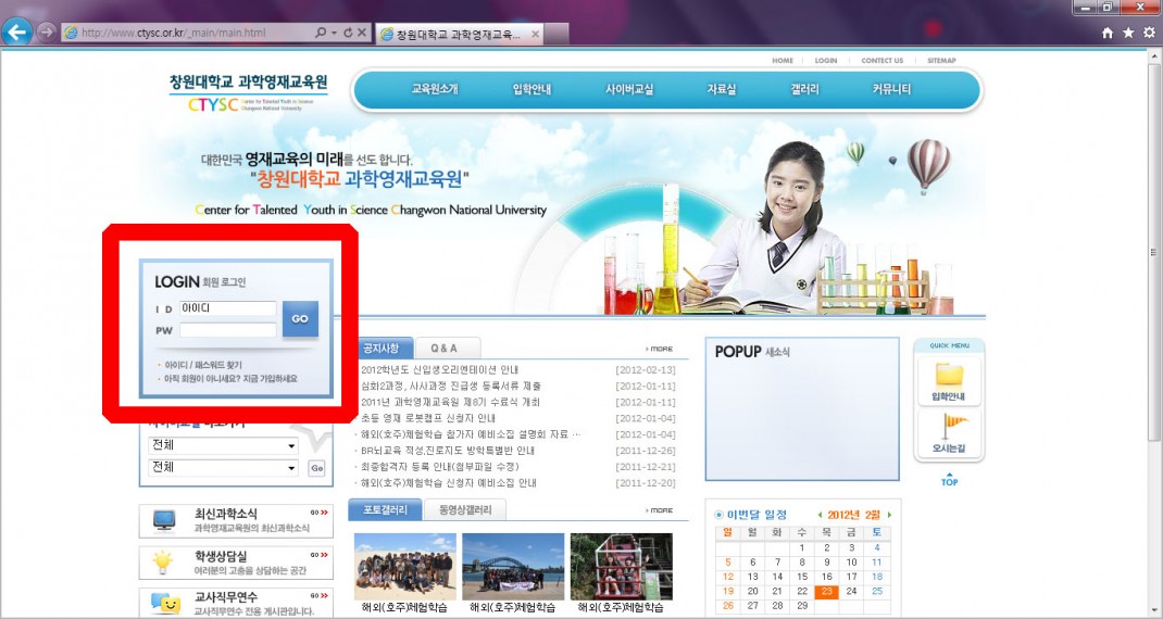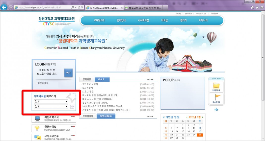 자신의 아이디와 비밀번호로 영재원 홈페이지에 로그인을 한 뒤 그림의 빨간 네모 부분에 사이버교실을 선택합니다. 자신의 분야를 선택한 다음 GO를 클릭합니다.(화면의 그림은 예시를 나타낸겁니다. 반드시 자신의 분야를 선택해 주세요)