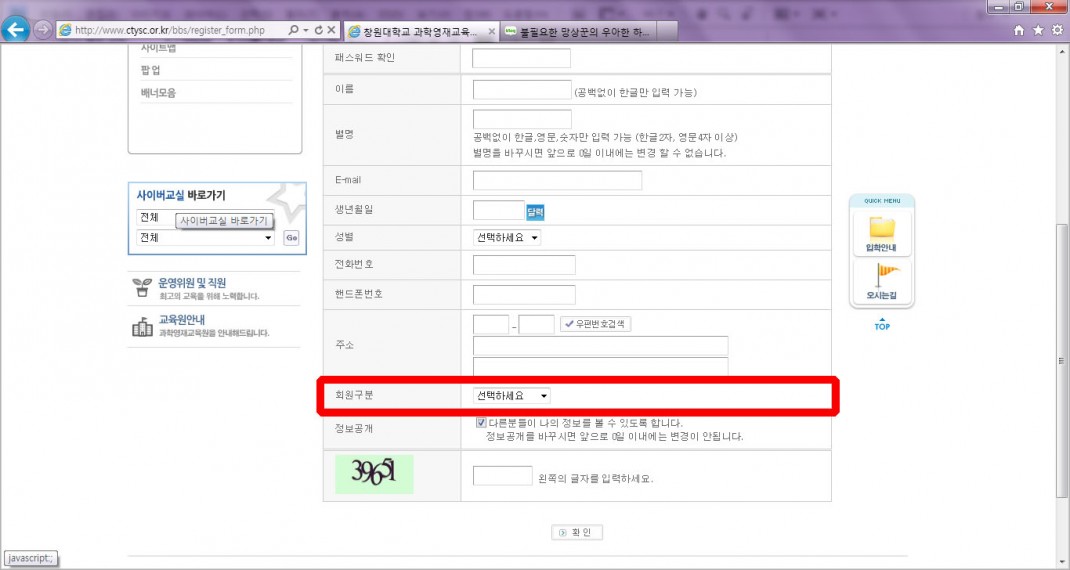자신의 정보를 맞게 기입 합니다. 그리고 제일 중요한 회원 구분을 잘 선택해야 합니다.(회원구분을 잘못 선택하면 사이버 교실에 가입을 하지 못합니다.) 영재원 학생이면 학생을 선택하시고 학부모님이시면 학부모를 선택해주세요![]()