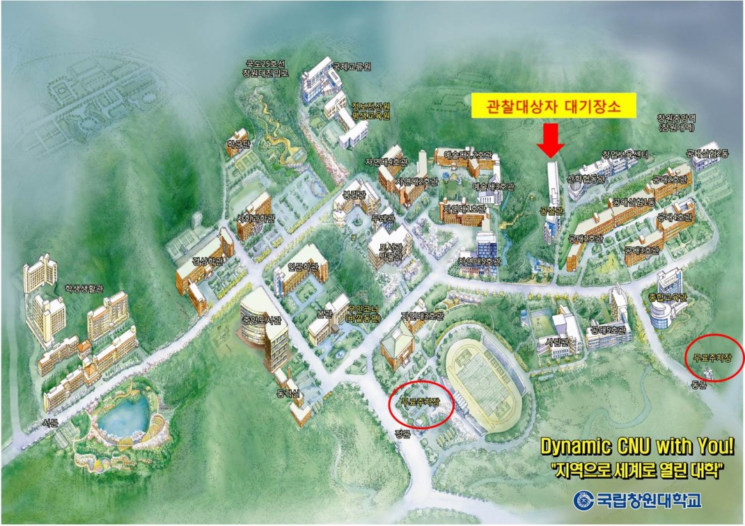 - 1시간 초과 일반 차량은 종합교육관 1층, 본관동편 무인발급기에서 할인주차권(1일 1,000원권)을 구매하여 정문으로 출차하시기 바랍니다.